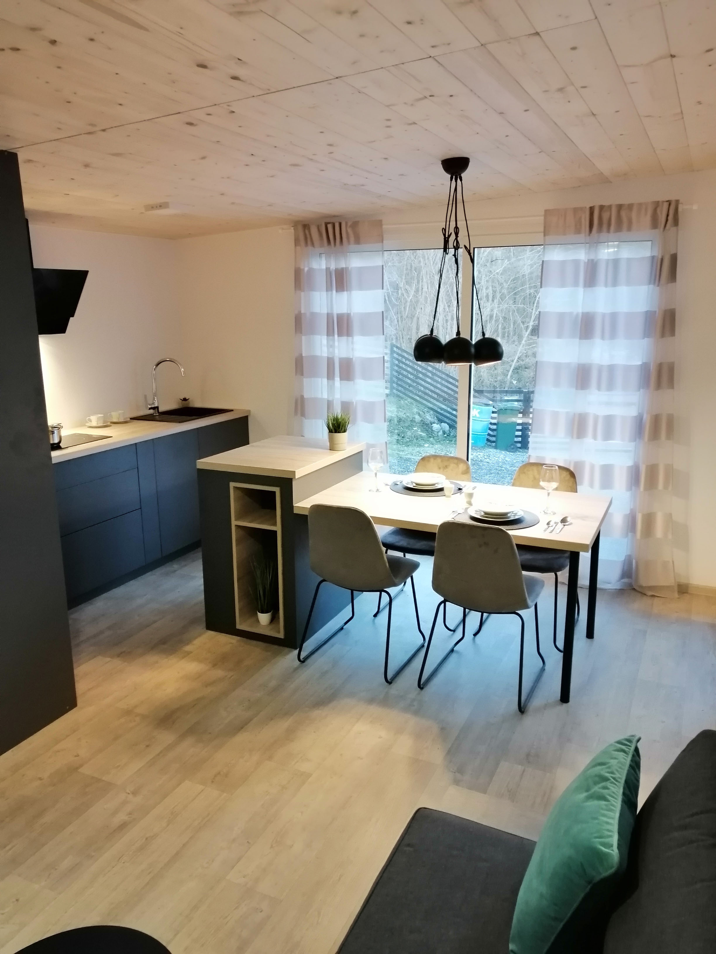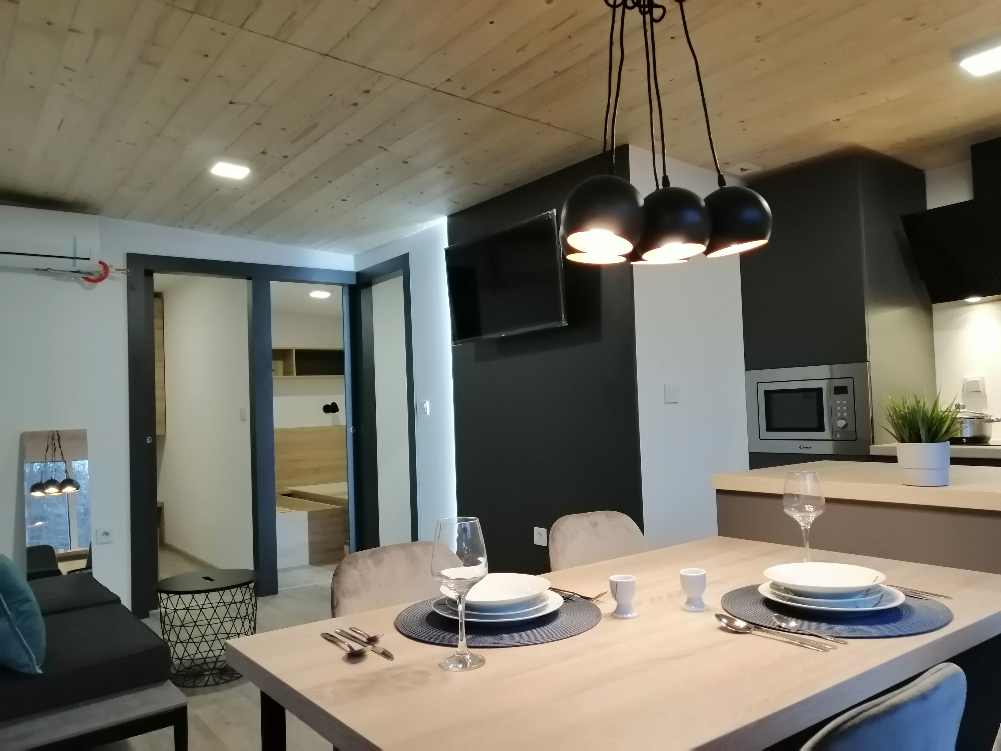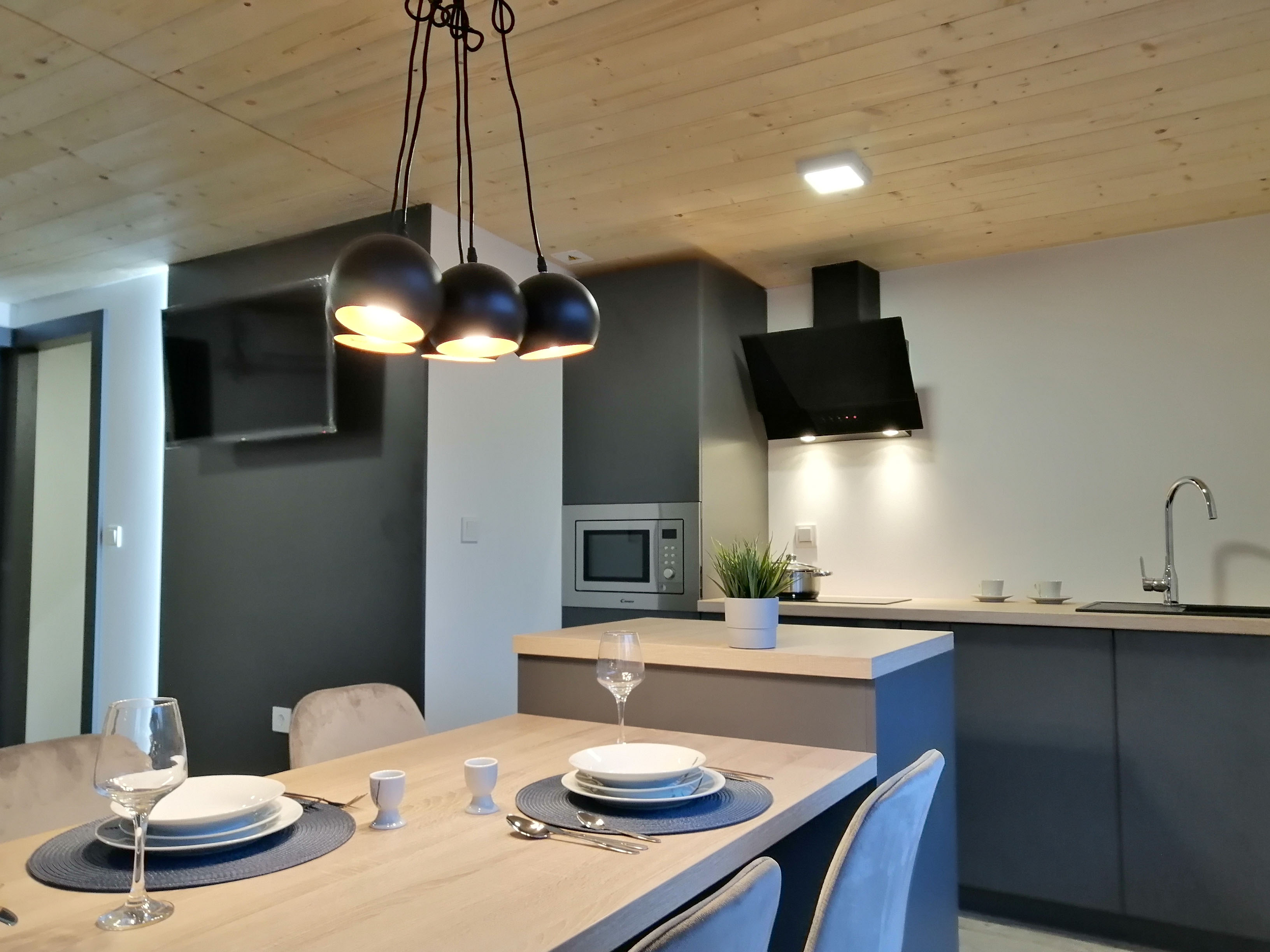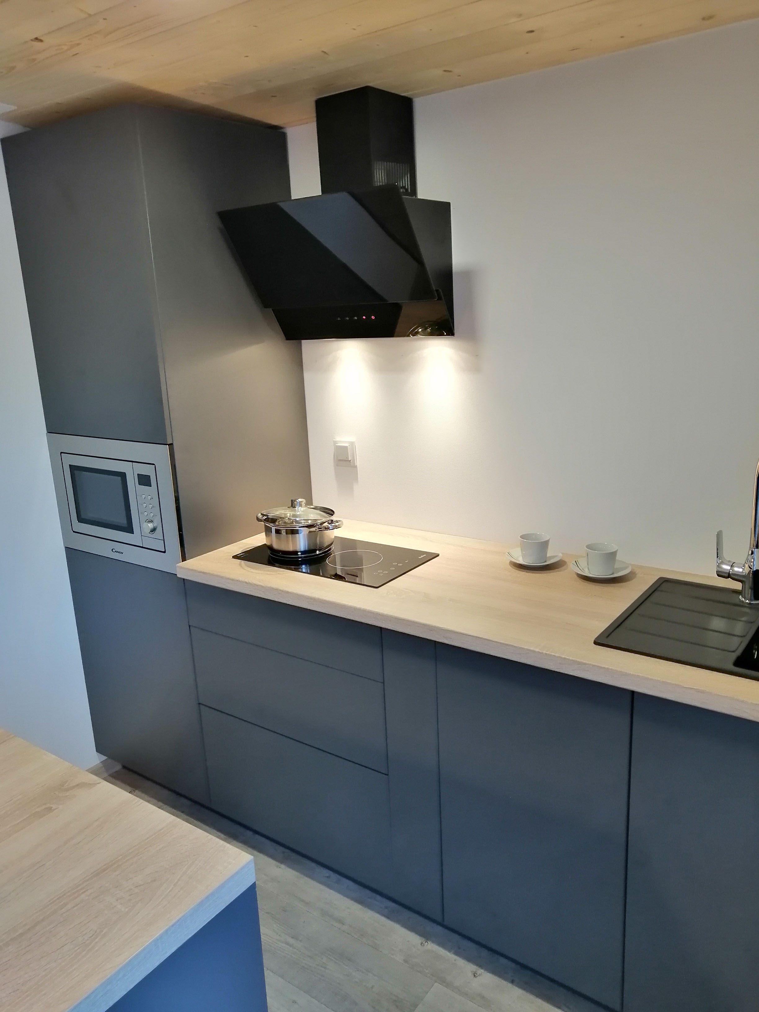 Kuhinja - Kuhinjski elementi od oplemenjena iverica 18 mm, el. ploča za kuhanje, sudoper sa slavinom, hladnjak sa zamrzivačem, napa, ugradbena mikrovalna, perilica za suđe 45cm , el. bojler 50L.