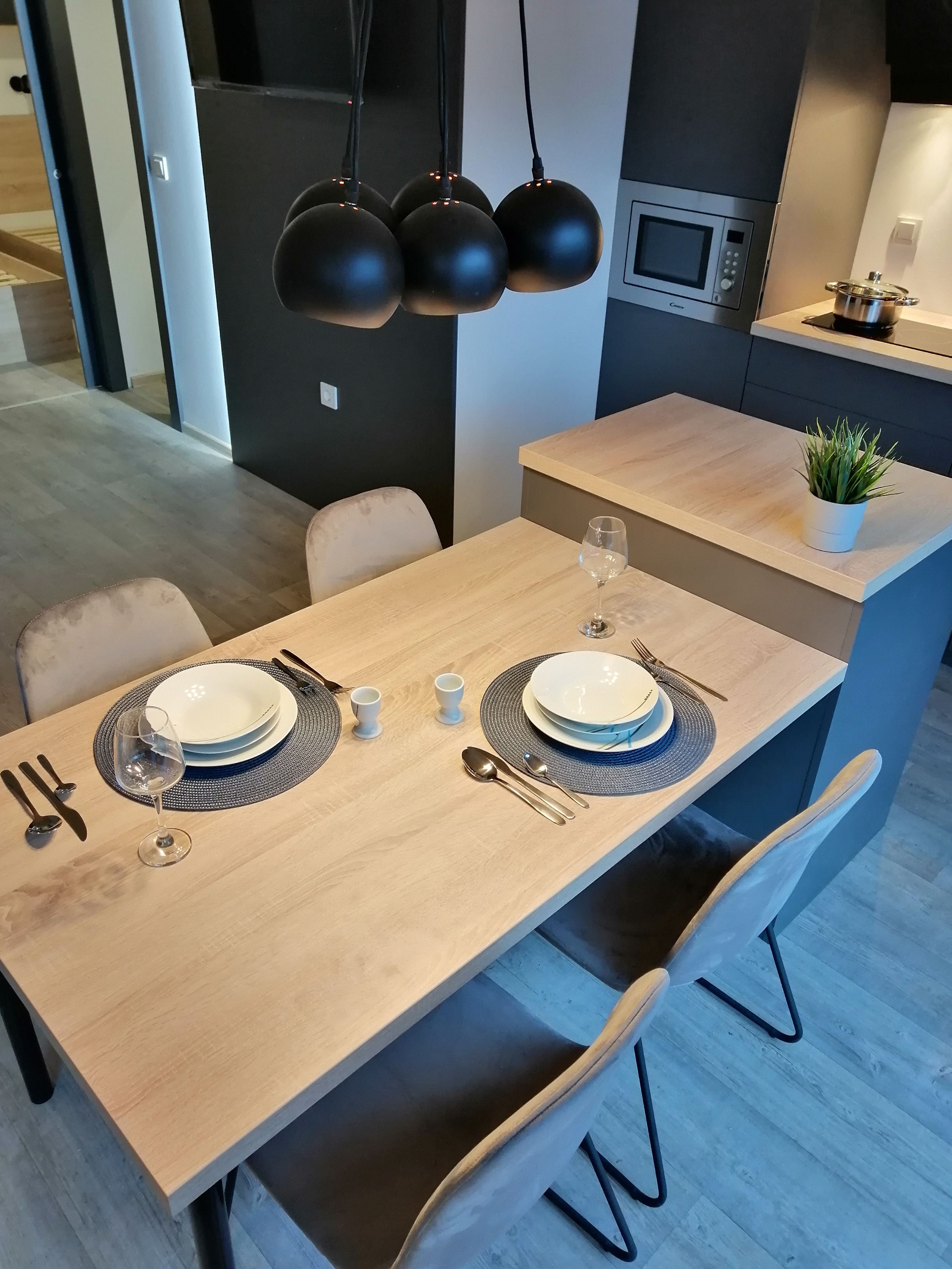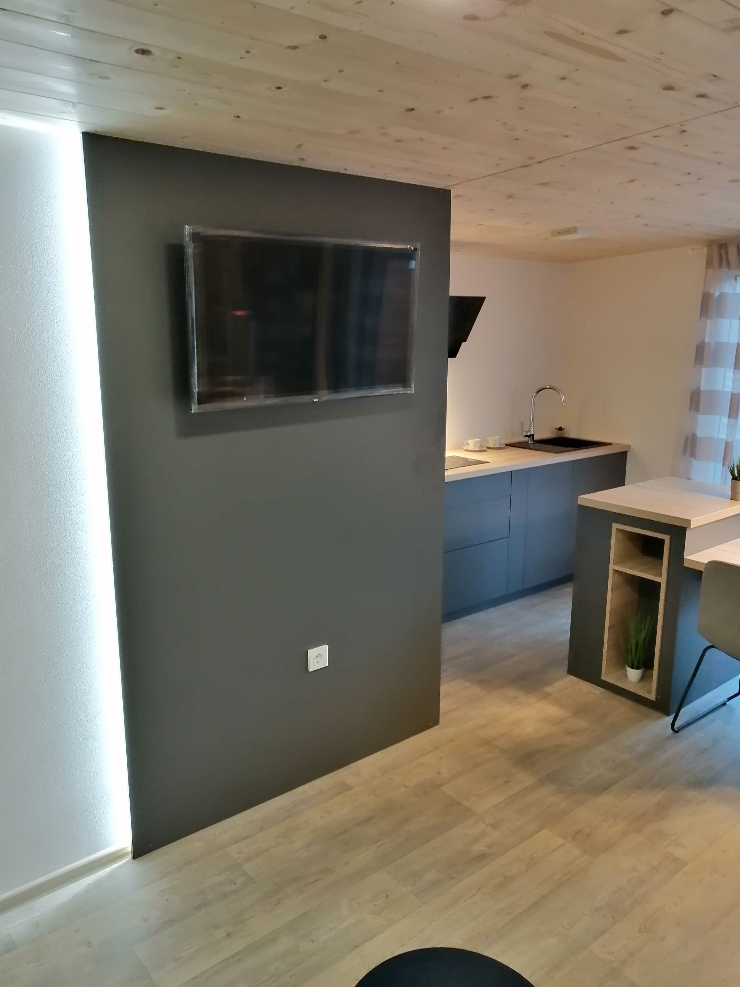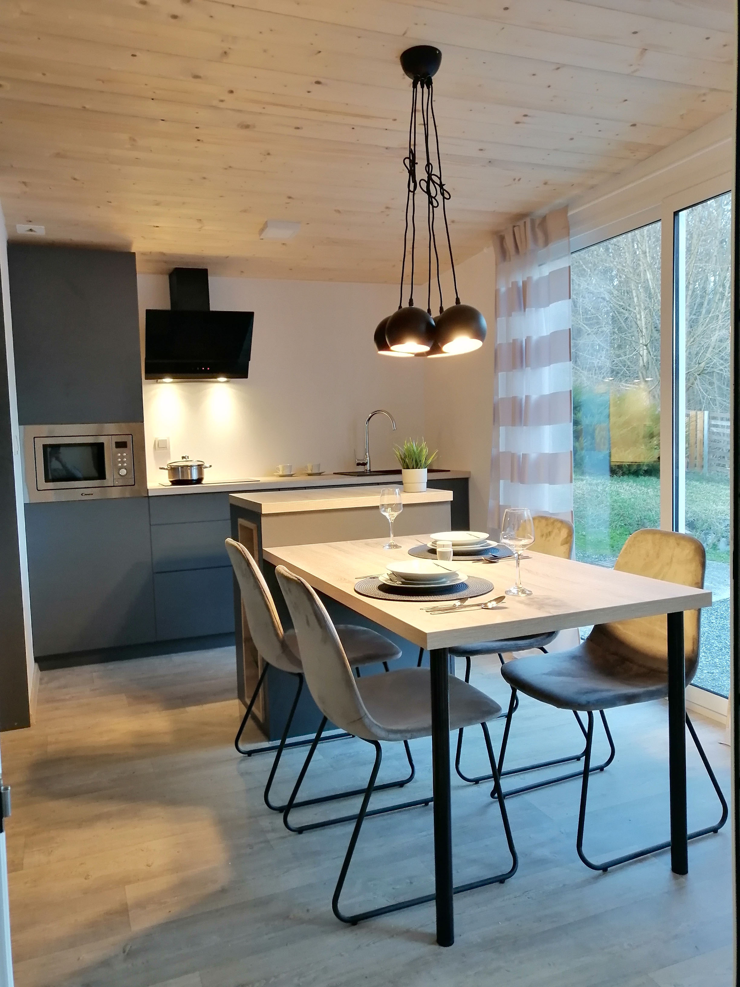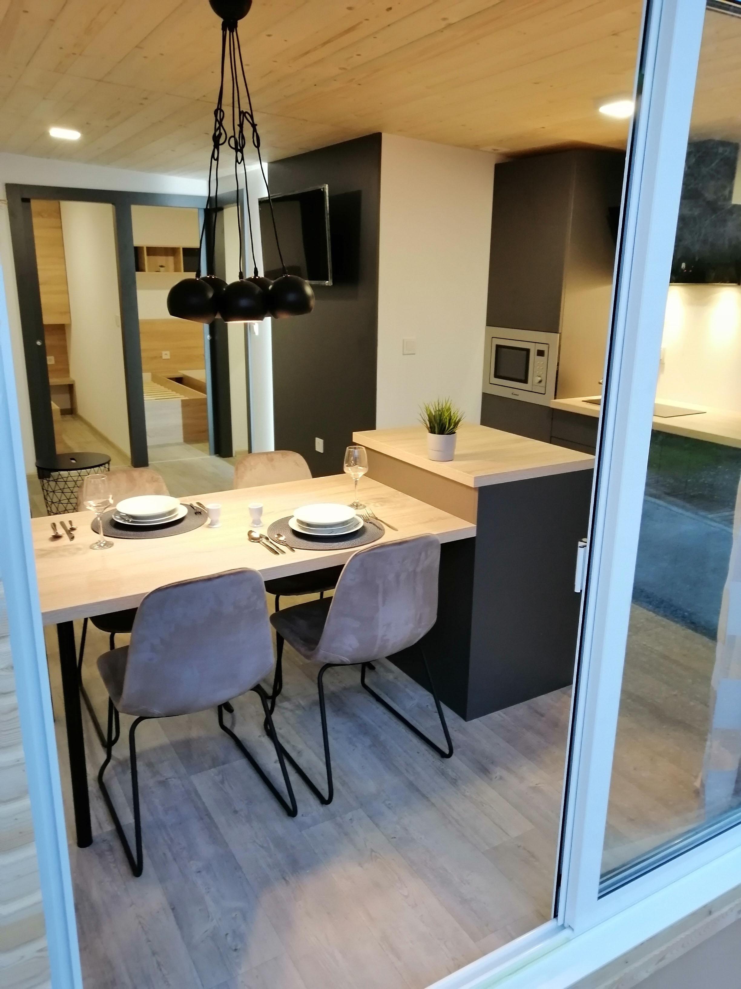 Kuhinja - Kuhinjski elementi od oplemenjena iverica 18 mm, el. ploča za kuhanje, sudoper sa slavinom, hladnjak sa zamrzivačem, napa, ugradbena mikrovalna, perilica za suđe 45cm , el. bojler 50L.