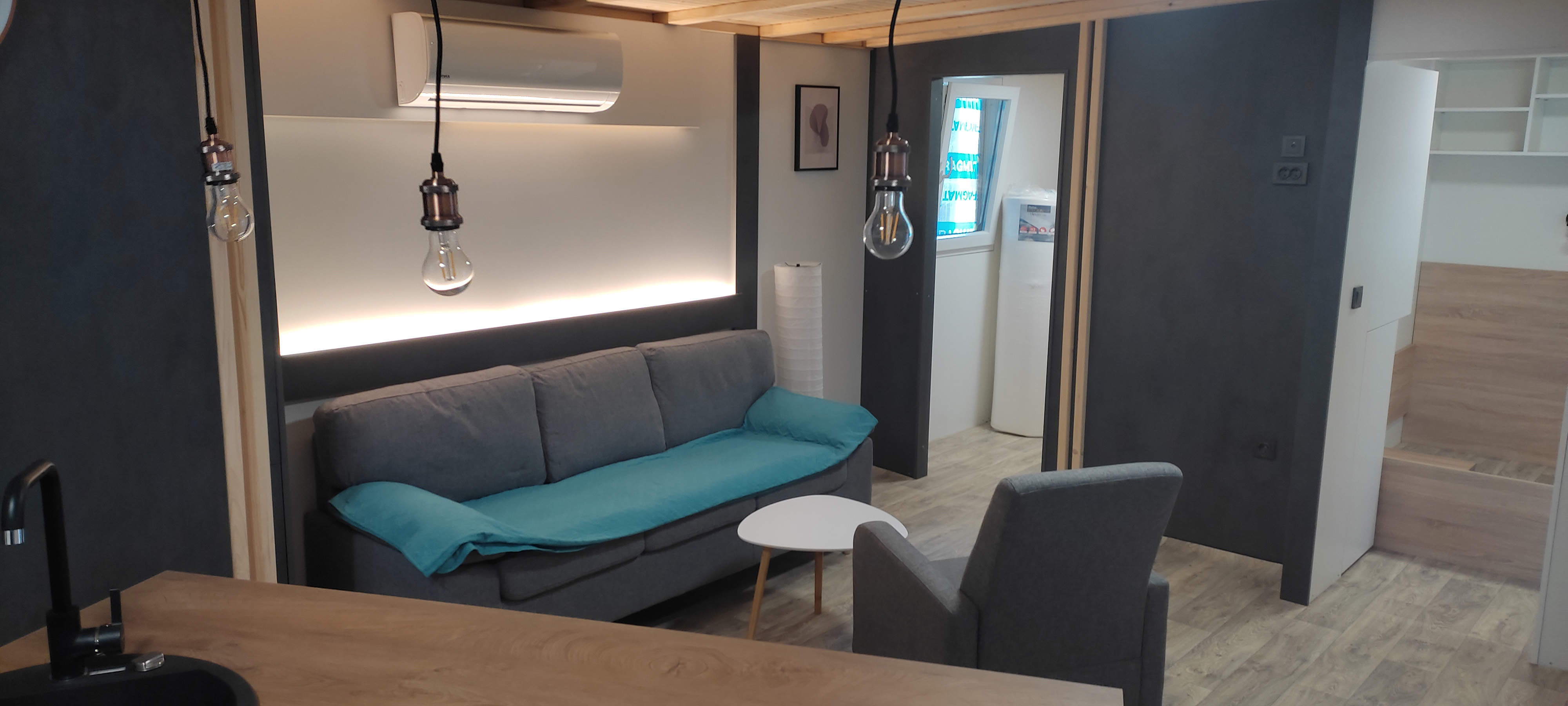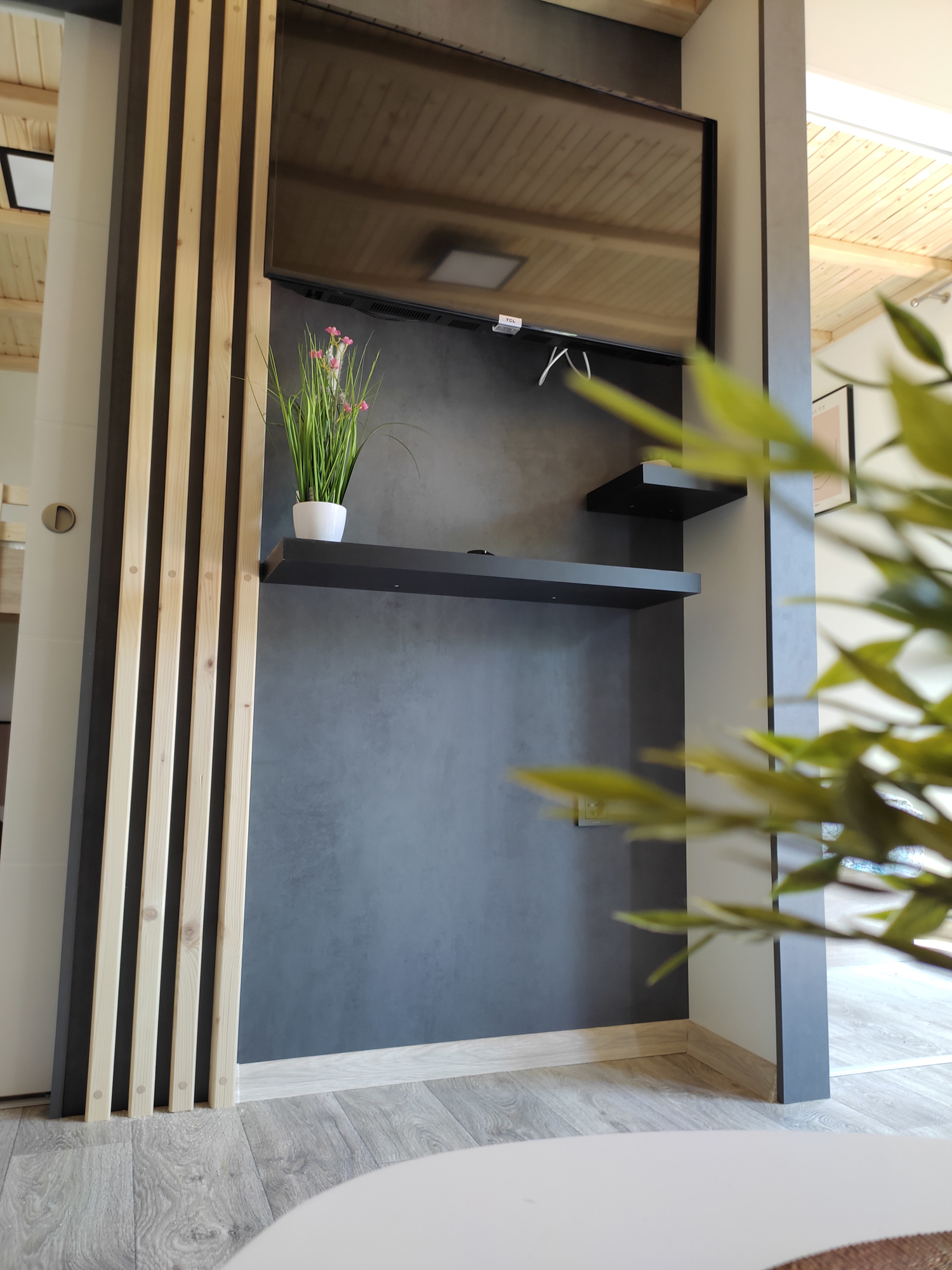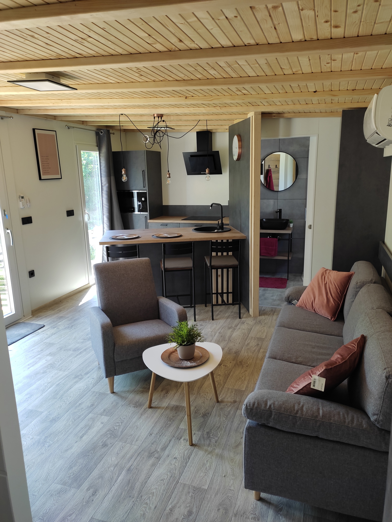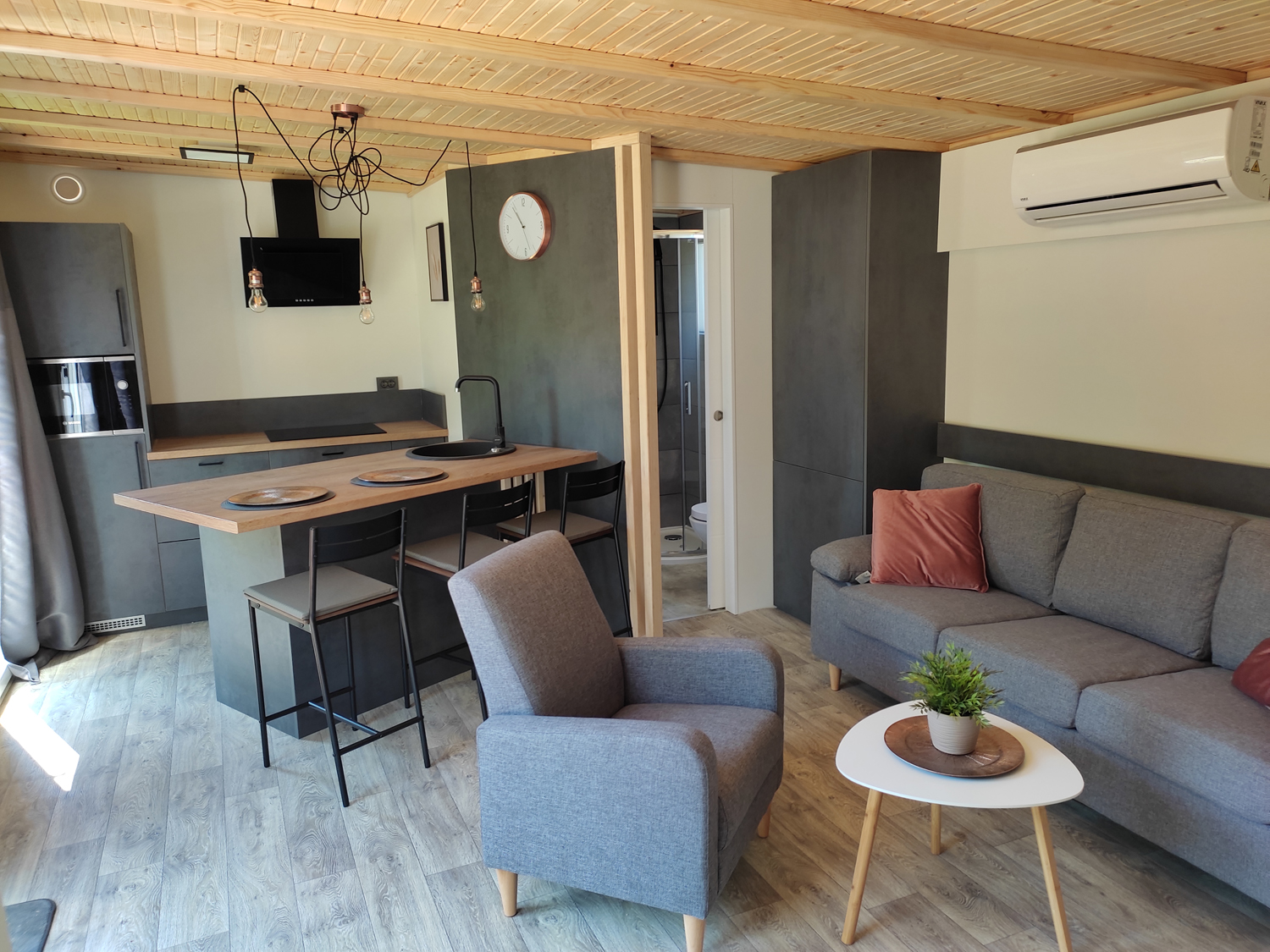 Dnevni boravak - 3 barske stolice, polica, smart televizor 40 incha - lcd, klima uređaj, trosjed, fotelja, klub stolić