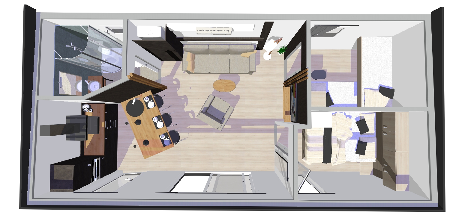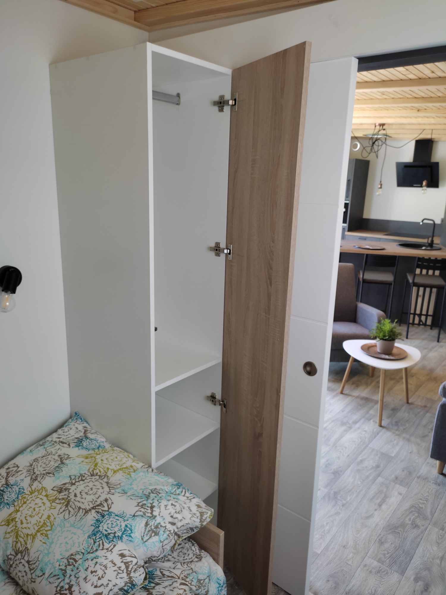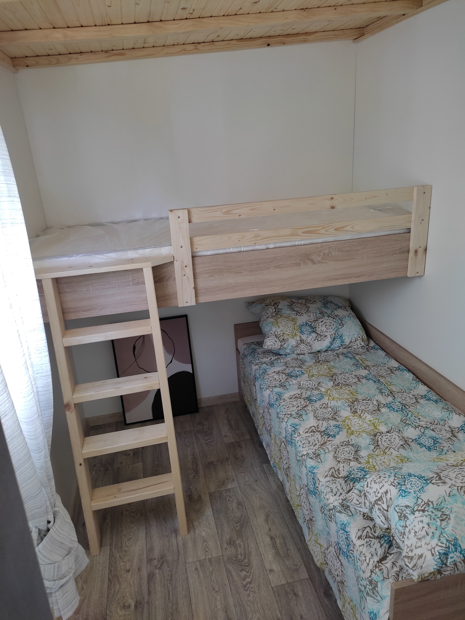 Spavaća soba 1 - bračni krevet 140x200 cm + podnice i madrac, 1 noćna polica, ormar za odjeću, "most" iznad kreveta za odlaganje stvari.