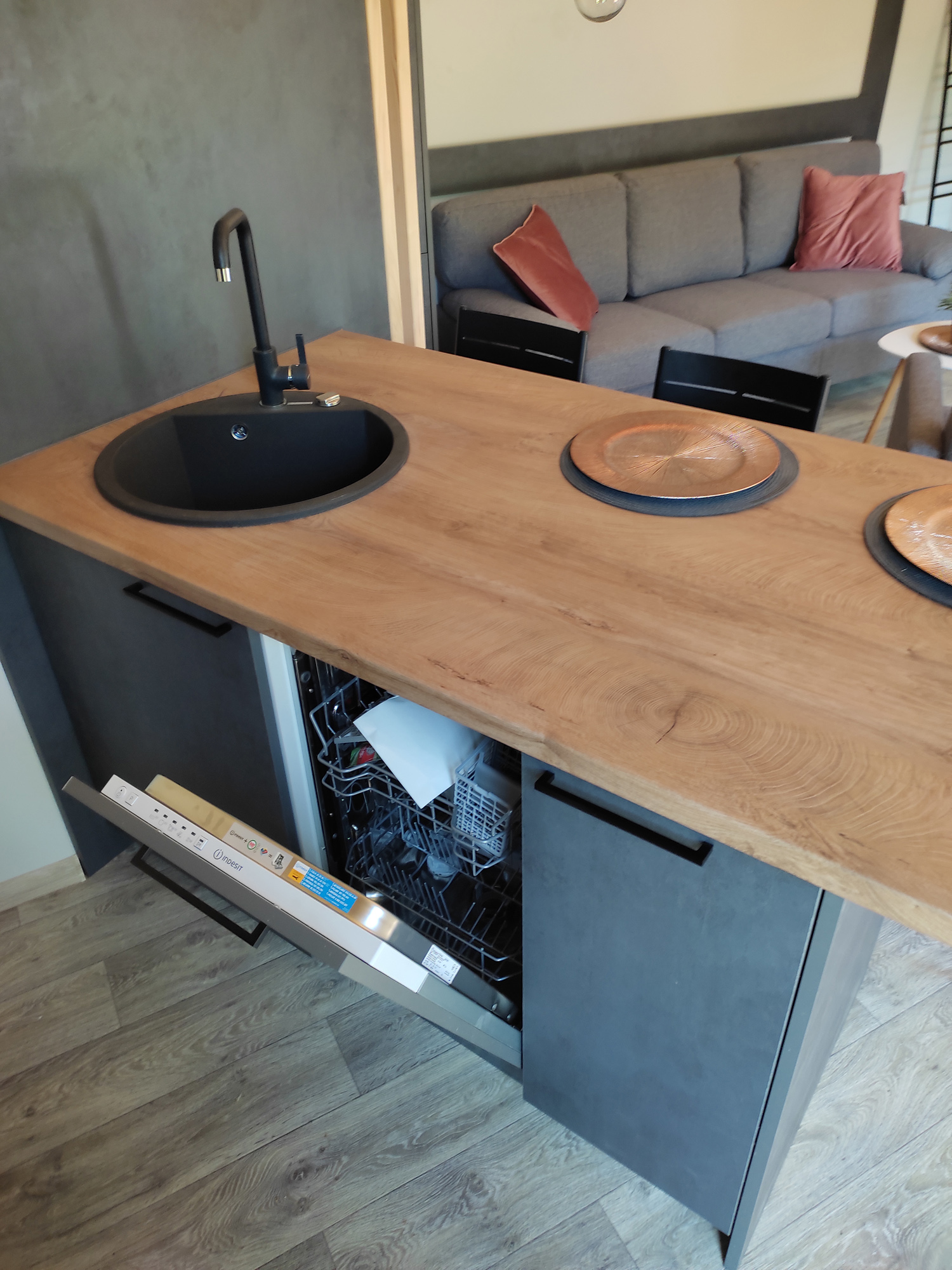 Kuhinja - Kuhinjski elementi od oplemenjena iverica, el. ploča za kuhanje, sudoper sa slavinom, napa, perilica za suđe, hladnjak sa ledenicom, mikrovalna.