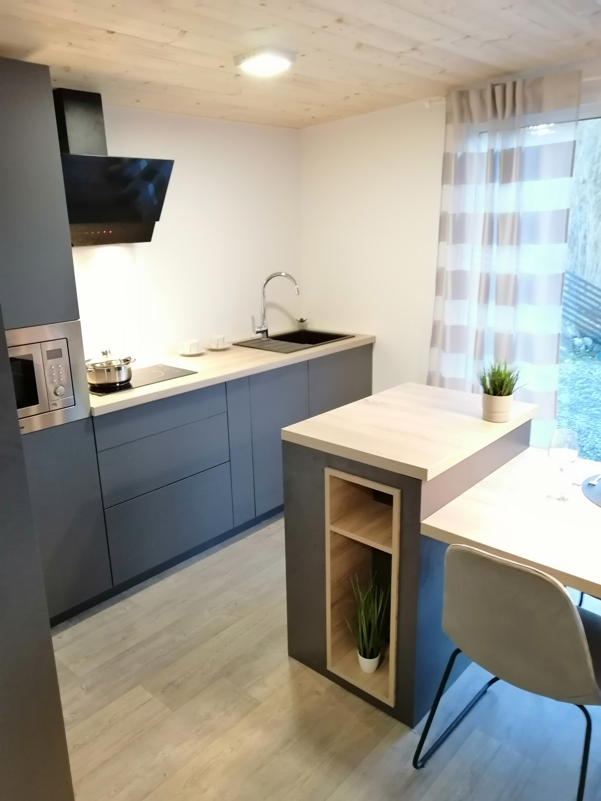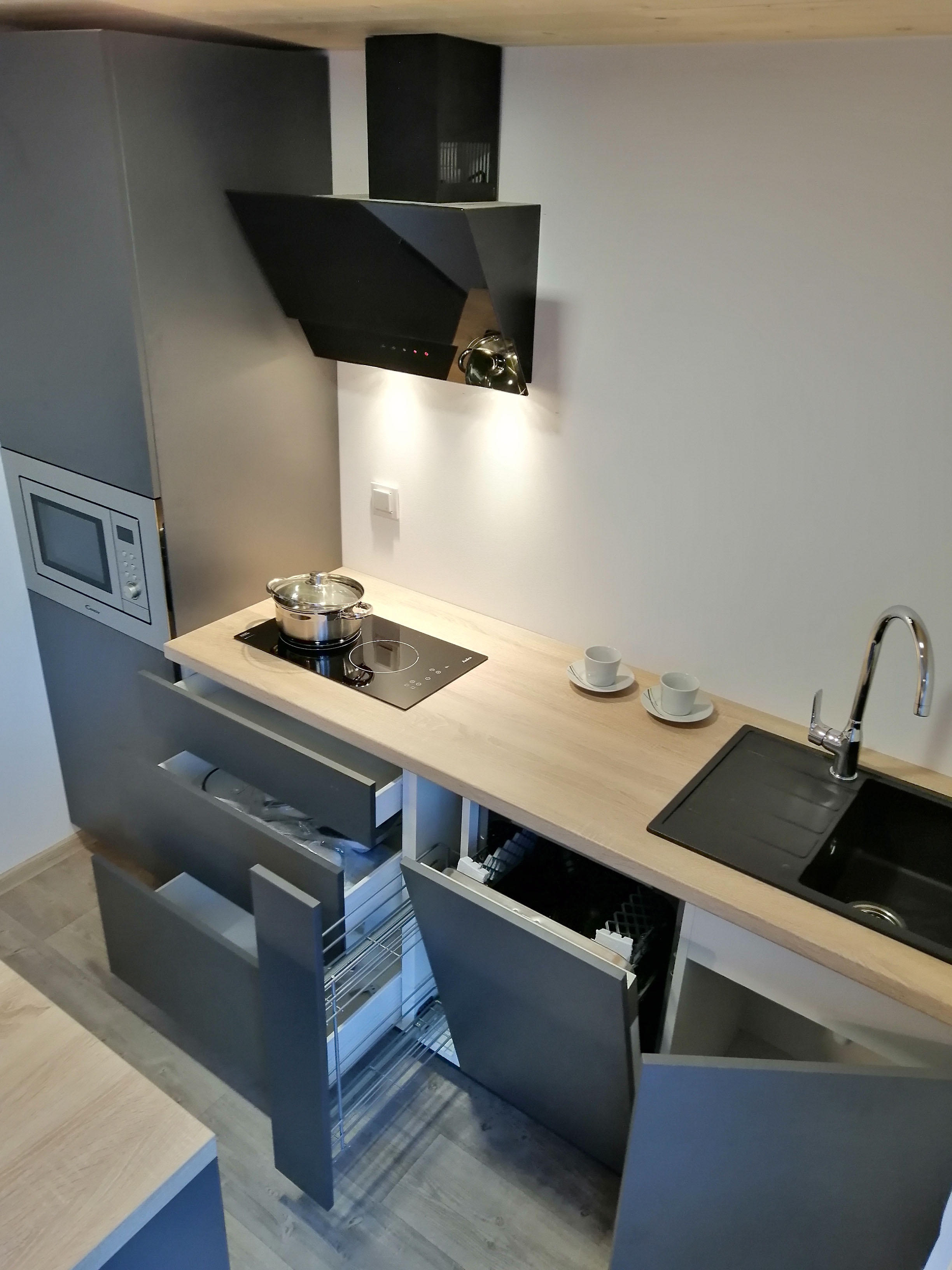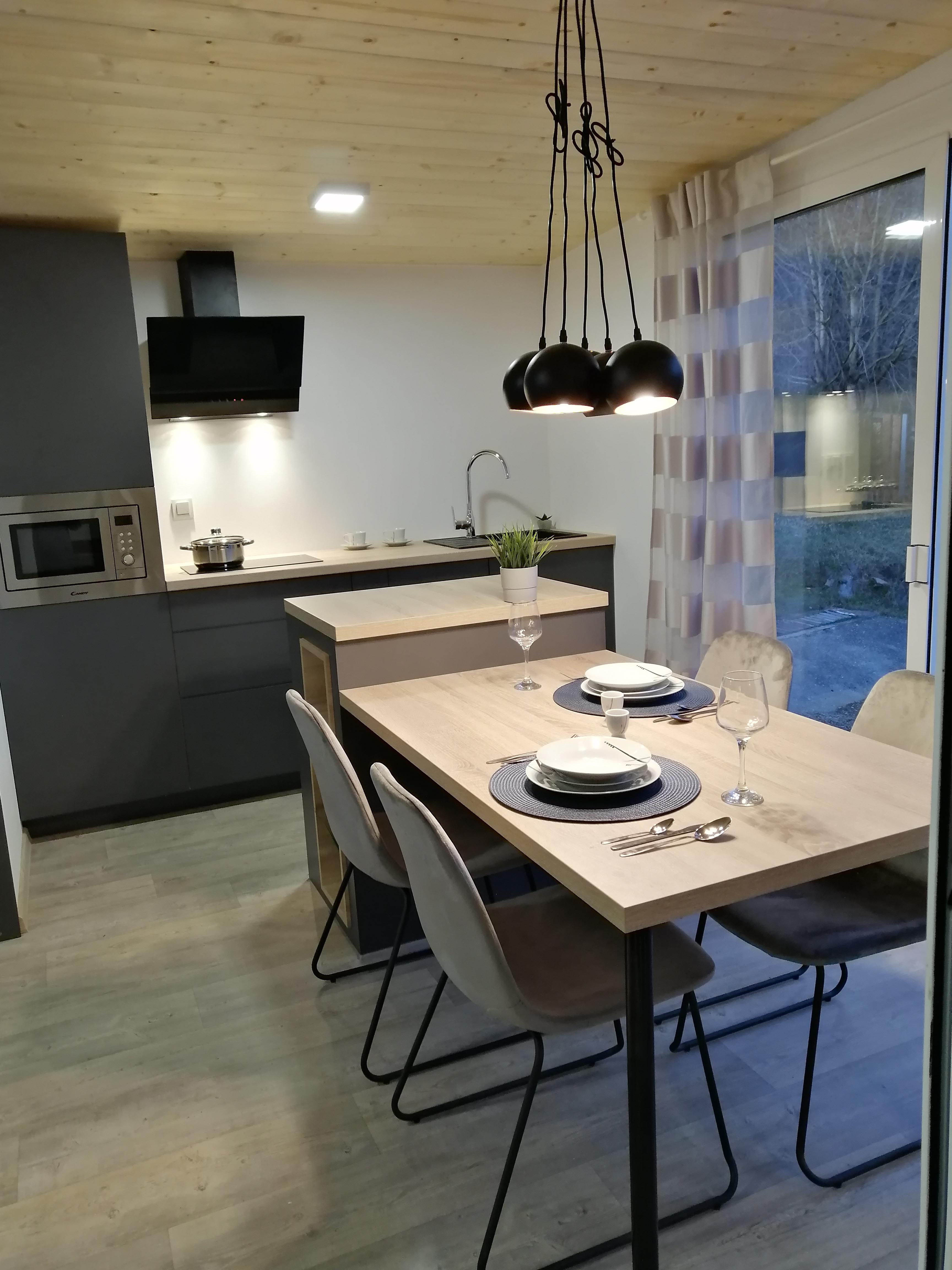 Kuhinja - Kuhinjski elementi od oplemenjena iverica 18 mm, el. ploča za kuhanje, sudoper sa slavinom, hladnjak sa zamrzivačem, napa, ugradbena mikrovalna, perilica za suđe 45cm , el. bojler 50L.