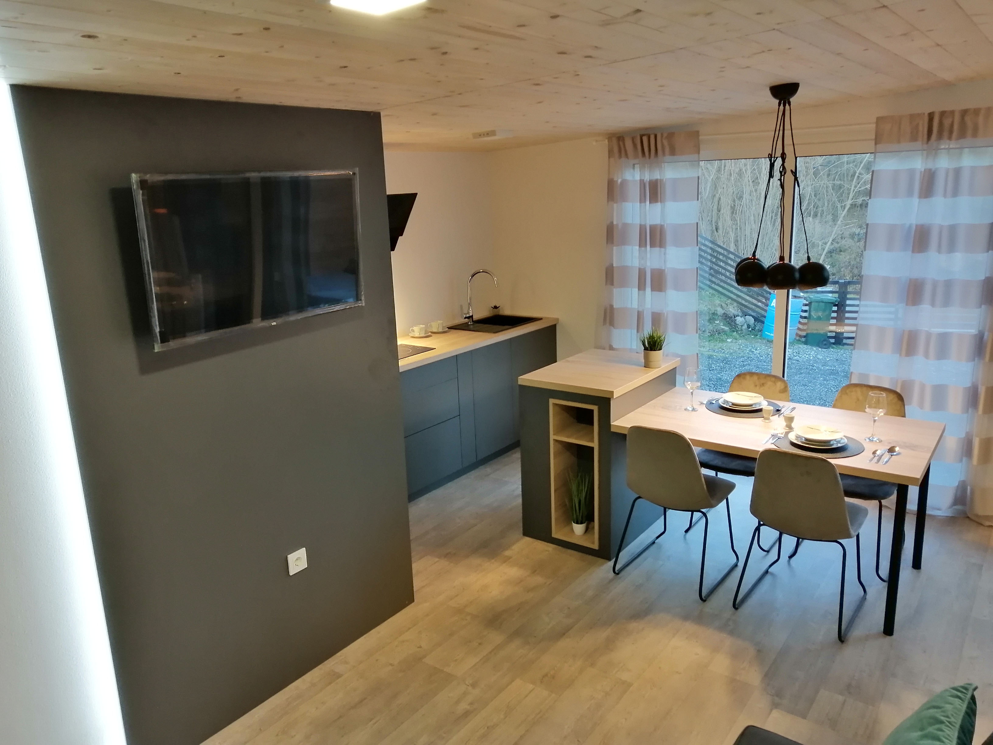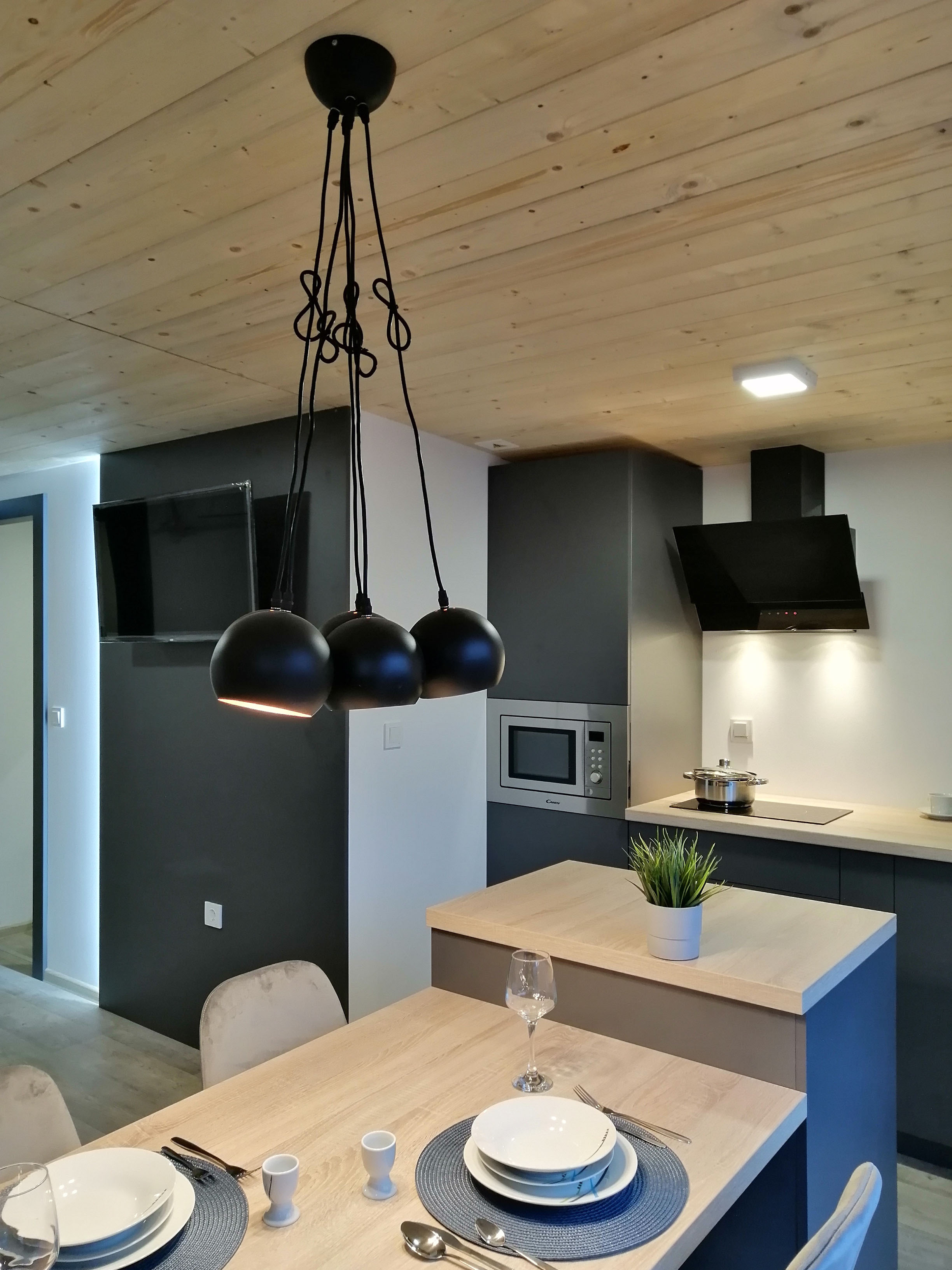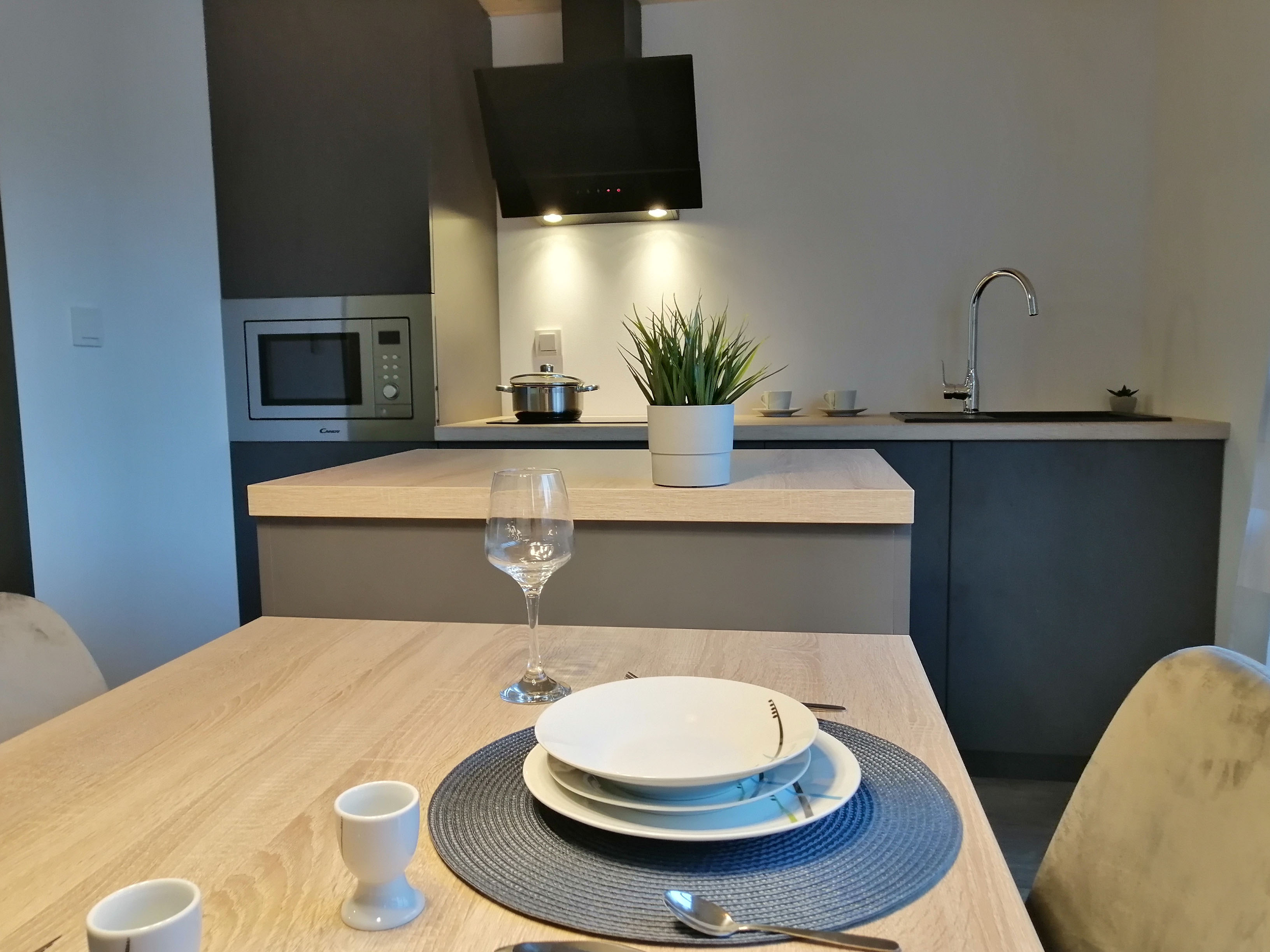 Kuhinja - Kuhinjski elementi od oplemenjena iverica 18 mm, el. ploča za kuhanje, sudoper sa slavinom, hladnjak sa zamrzivačem, napa, ugradbena mikrovalna, perilica za suđe 45cm , el. bojler 50L.