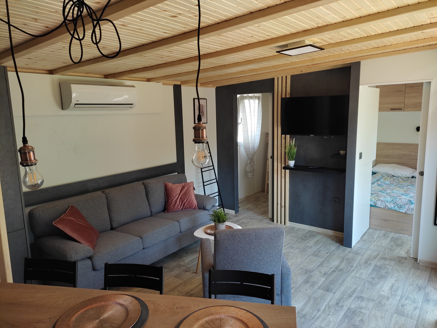Dnevni boravak - 3 barske stolice, polica, smart televizor 40 incha - lcd, klima uređaj, trosjed, fotelja, klub stolić
