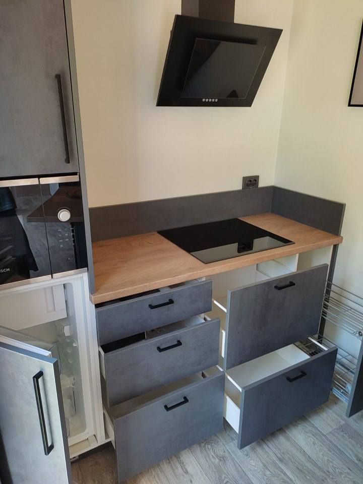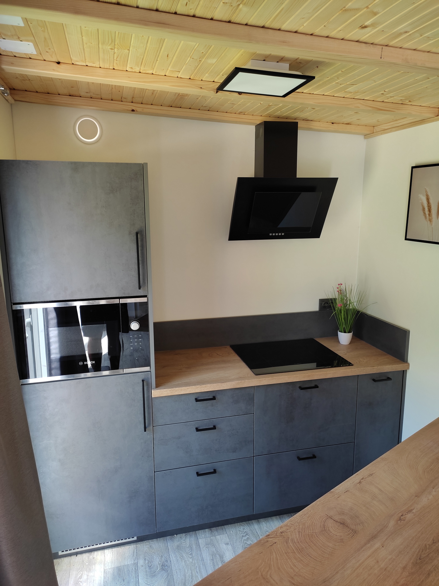 Kuhinja - Kuhinjski elementi od oplemenjena iverica, el. ploča za kuhanje, sudoper sa slavinom, napa, perilica za suđe, hladnjak sa ledenicom, mikrovalna.